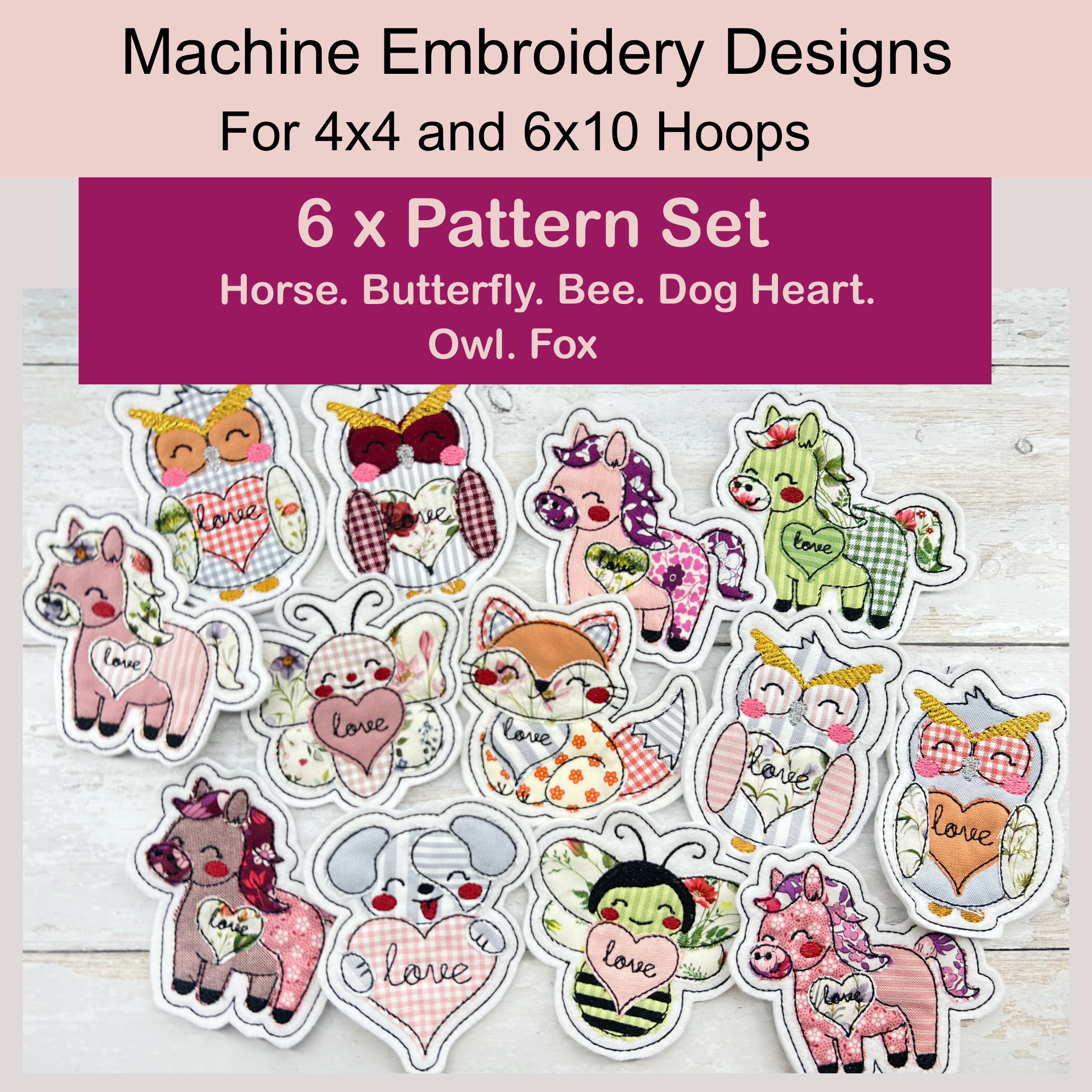 6x In the Hoop Machine Embroidery Designs – ITH Appliqués of Horse, Butterfly, Bee, Dog Heart, Owl & Fox