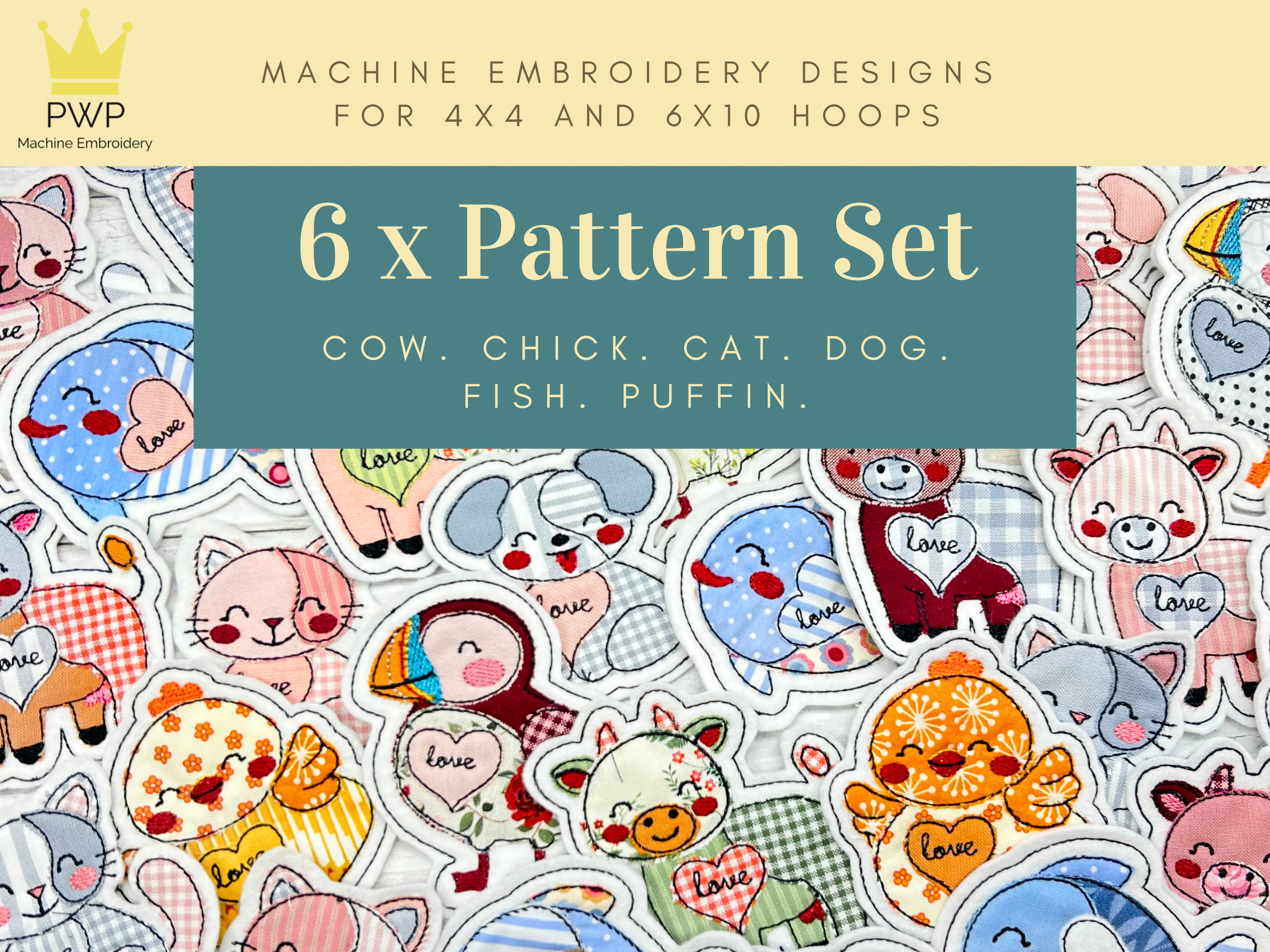6x In the Hoop Machine Embroidery Designs – ITH Appliqués of Cow. Cat. Dog. Puffin. Fish. Chick.