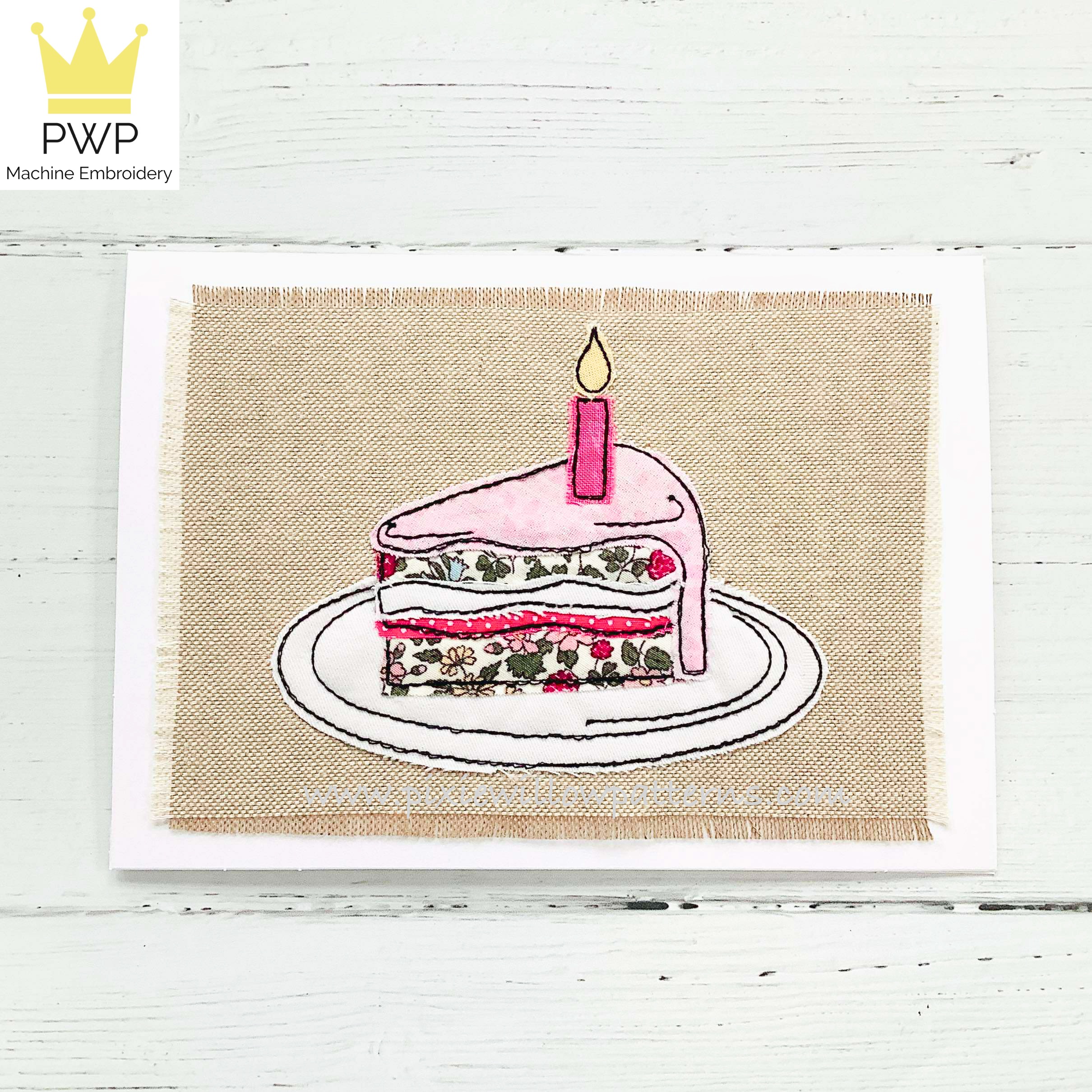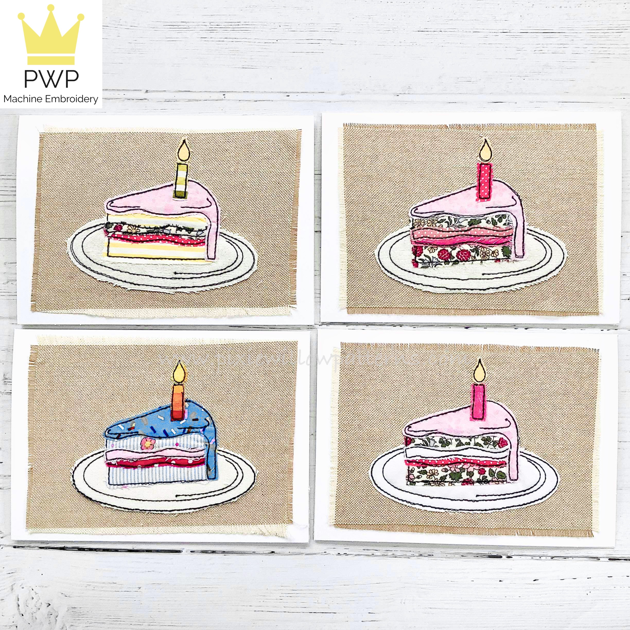 This is a simple machine embroidery pattern, of a slice of birthday cake applique. The raw edge design, has a slightly free motion embroidery feel to it, and would make a wonderful design to adorn the front of greeting cards. I made a batch that I’m going to keep in my stash, ready to give to friends and family when celebrating birthdays (if you skip the step that sews the candle, perhaps it could be used to celebrate other occasions too?).