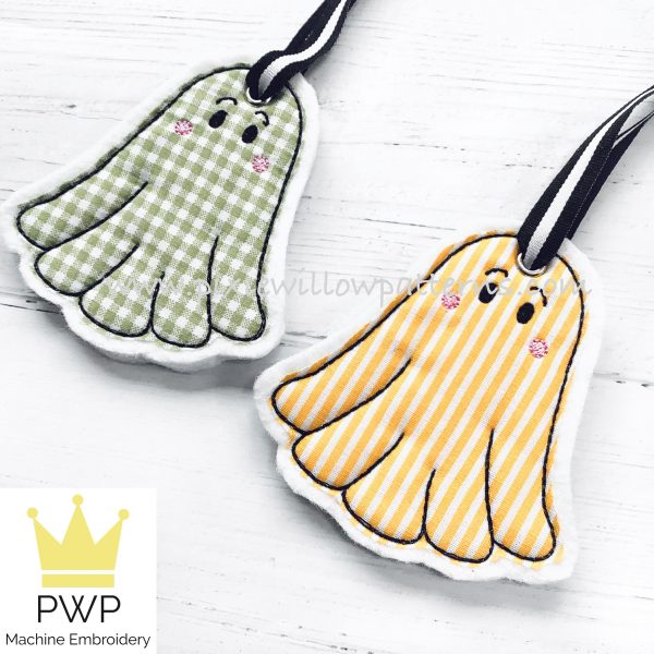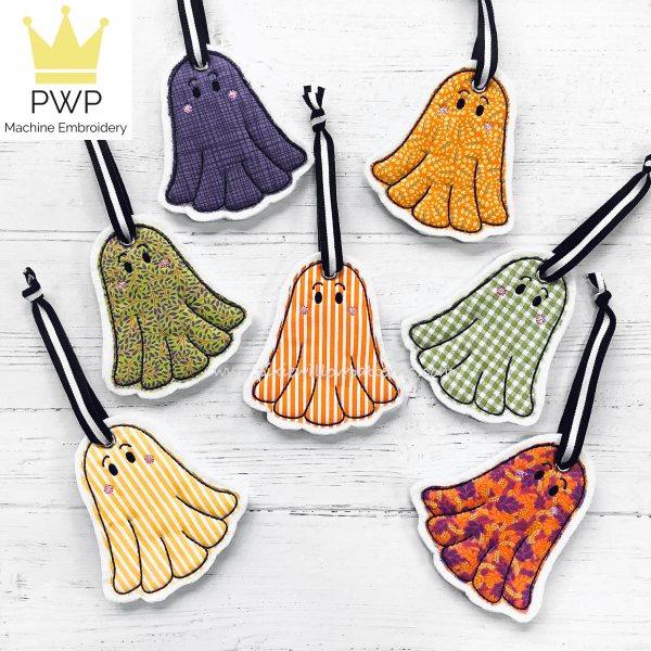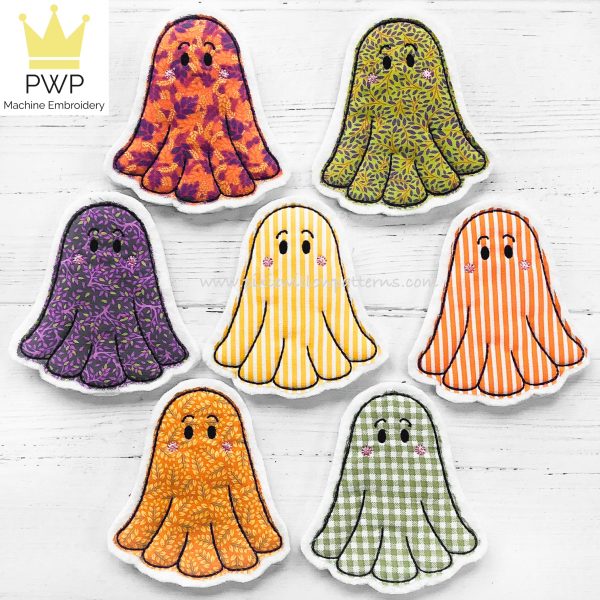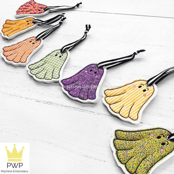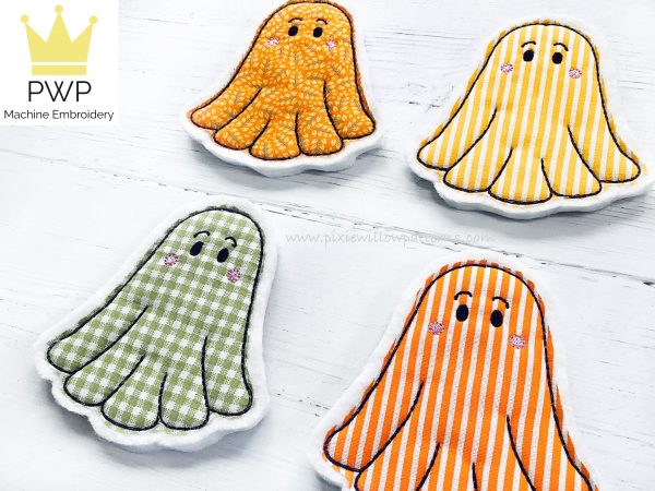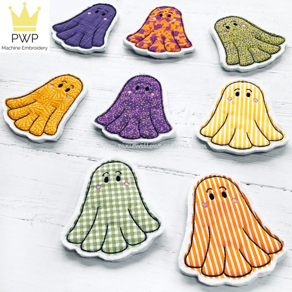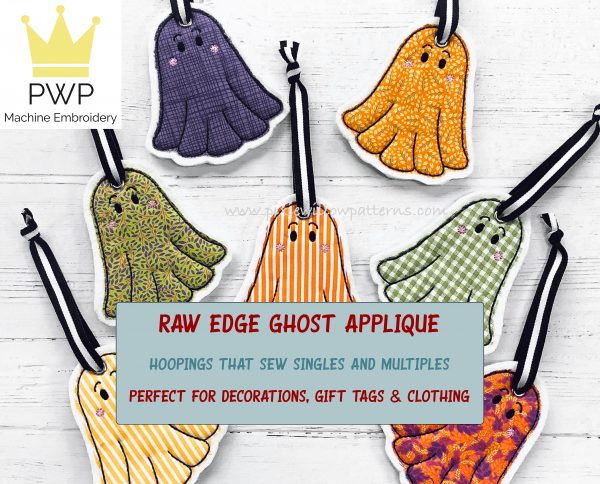 Raw Edge Applique Ghost design. Looks like free motion Embroidery. ITH Machine Embroidery pattern for 4×4, 5×7, 6×10, 8×11 and 9×12 hoops
