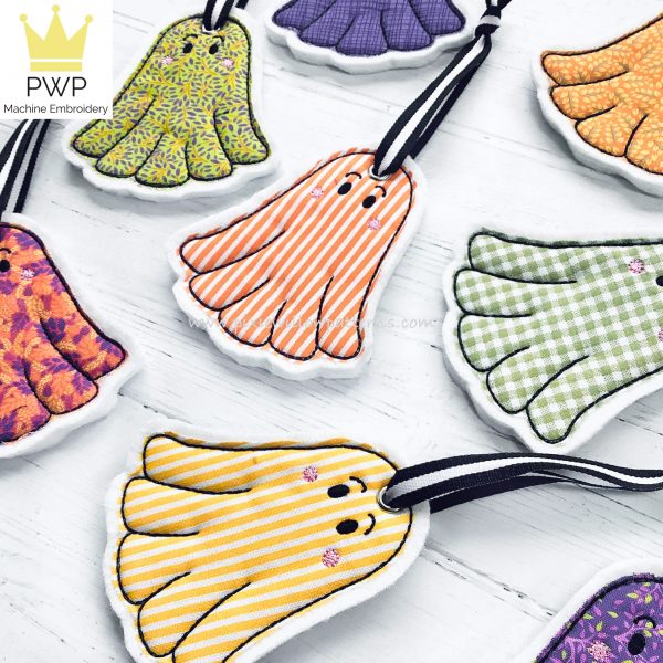 This machine embroidery pattern, has comprehensive instructions written in English. There are also photos to accompany each step for those who like a visual guidance. The 4×4 hoop sews 1 ghost. The other hoops sew multiple ghosts of the same size as the 4×4, at the same time – perfect if you wish to make a garland.